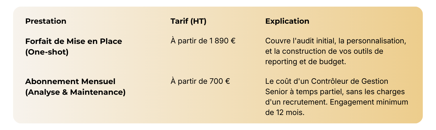 Ce que vous gagnez pour 700€/mois : L'assurance d'avoir des chiffres fiables, l'expertise d'analyse d'un DAF, et des conseils réguliers qui peuvent générer un Retour sur Investissement (ROI) immédiat en optimisations.